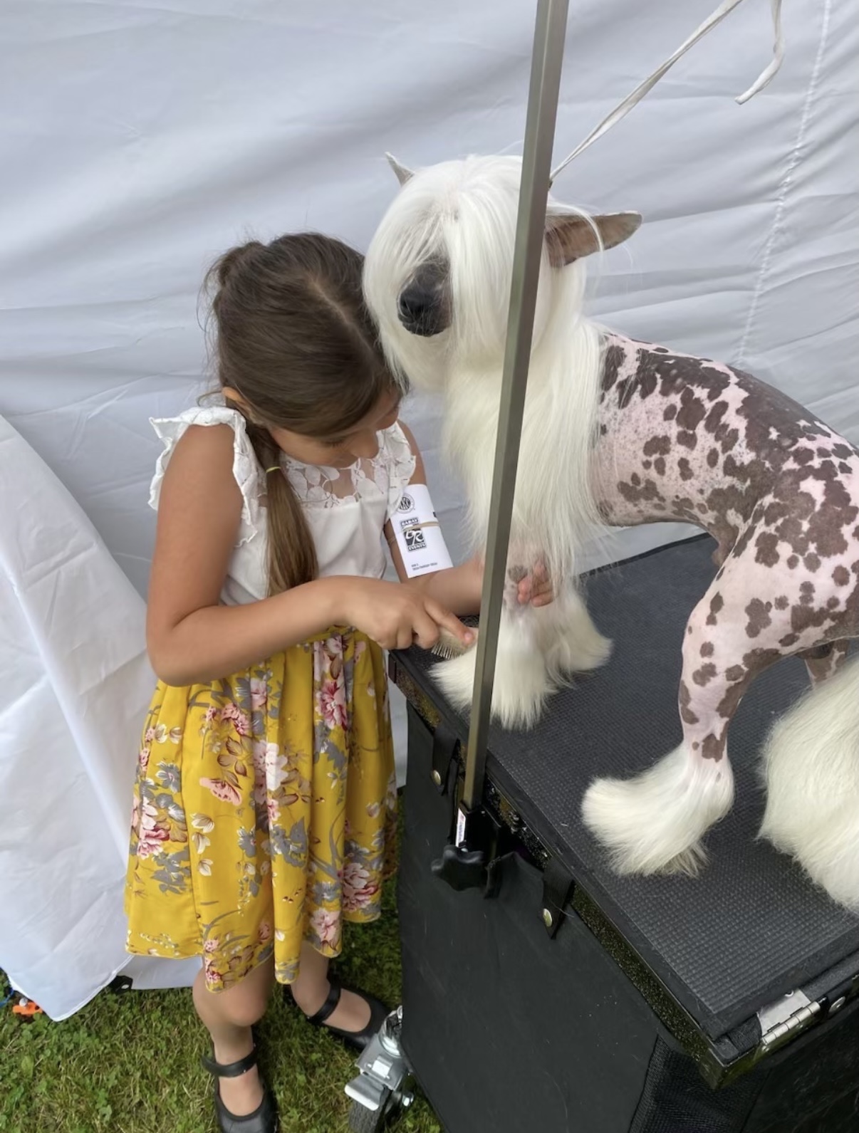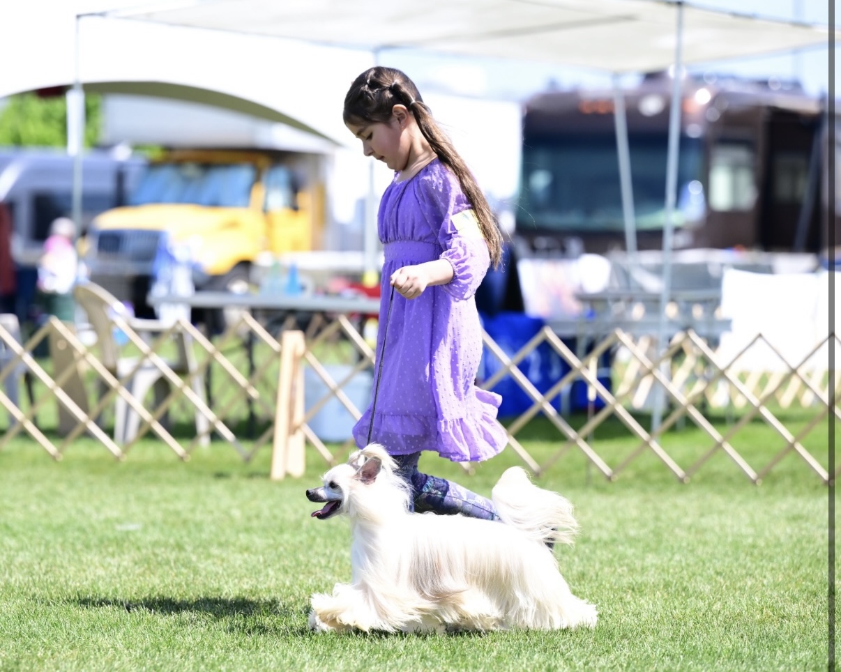 Thank you Sammie Lewis for sharing these adorable photos of your daughter, Olivia! Olivia is 7 years old and her best friend is her 13 year old Chinese Crested, Merigold. Sammie says, “Olivia has been involved with dogs since the day she was born. She loves the dogs – big and small – and enjoys everything with them from grooming, walking, handling and just loving on them. Her biggest success to date was winning Best Puppy In Show with her own puppy at an All Breed Show with over 100 puppies entered. She loves showing in the “real big ring” as she calls it but also participates in Pee Wee. Last weekend at the dog show she kept asking what she could do to help. She would wash buckets and bowls. She helped with feeding, watering, picking up after and watching dogs.” We look forward to watching Olivia grow up in the sport of purebred dogs!