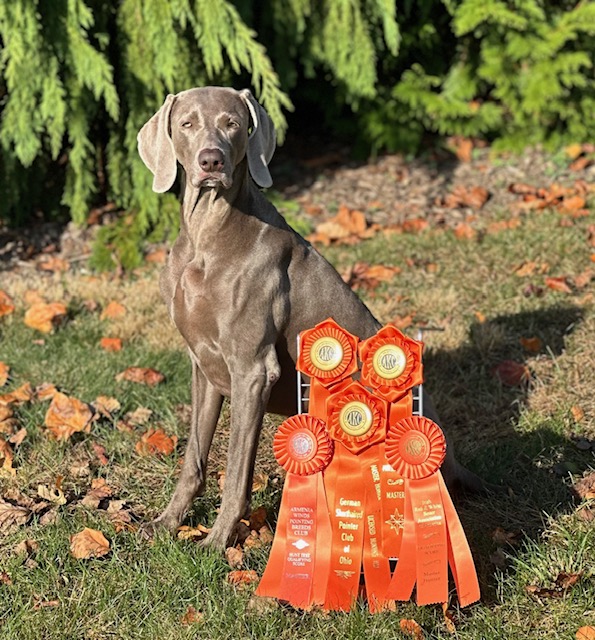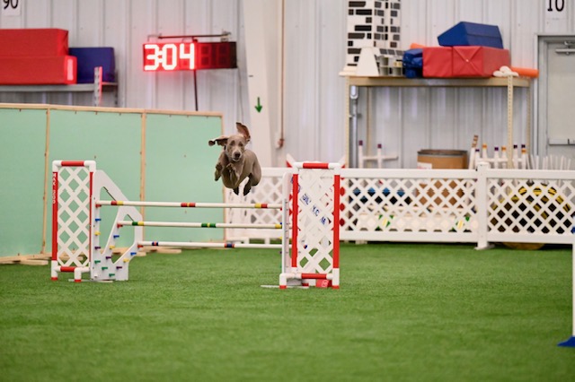 Thank you Kristen Julian for sharing this Form Follows Function photo of your Weimaraner, “Olive” (GCH CH MACH Shannondale’s Special Agent BN RE MH FDC MX MXB MXJ MJB MXF T2B CA FCAT ACT2 ACT2J THDN RATN CGCA CGCU STR TKI ATT VSWB FITG NSD NRD VX3), doing what she was bred to do! According to the American Kennel Club, “Olive” has recently become the first Weimaraner in breed history to achieve an AKC Grand Championship, AKC Master Agility Championship and a Master Hunter Title.  Kristen says, “Olive proves the versatility of this amazing breed by excelling in conformation, agility and the field.  Olive currently has 55 AKC and WCA titles as well as a Versatile Excellent 3 Rating.” Beyond this, Olive is also a Sporting Group Winner and 2x Weimaraner Club Of America Duel Weimaraner Award recipient. Olive is owned by Kristen Julian and was bred by Allyson Chaney & Teresa Evans. Congratulations on your incredible accomplishments Olive!