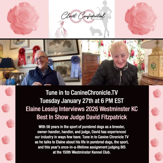 Dont’ Miss Closet Confidential Tomorrow where Elaine Lessig Interviews 2026 Westminster KC Best In Show Judge David Fitzpatrick