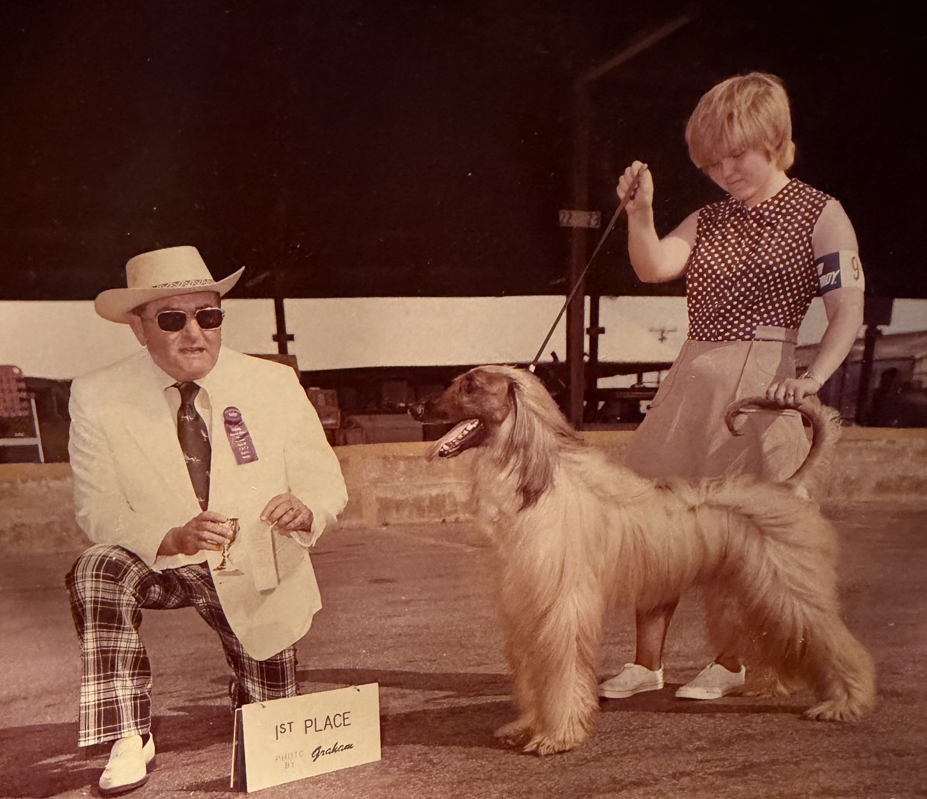 Answer: Judge Mr. Sam Lawrence, circa 1975, Augusta KC, Georgia. The Afghan is CH Well Duns Dhar-Amun, handled by Linda Dietrich and co-owned with his breeder Linda Rathbun